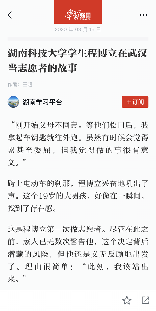 这是程博立第一次做志愿者。尽管在此之前,家人已无数次警告他,这个决定背后潜藏的风险,但他还是义无反顾地出发了。理由很简单:“此刻,我该站出来。”